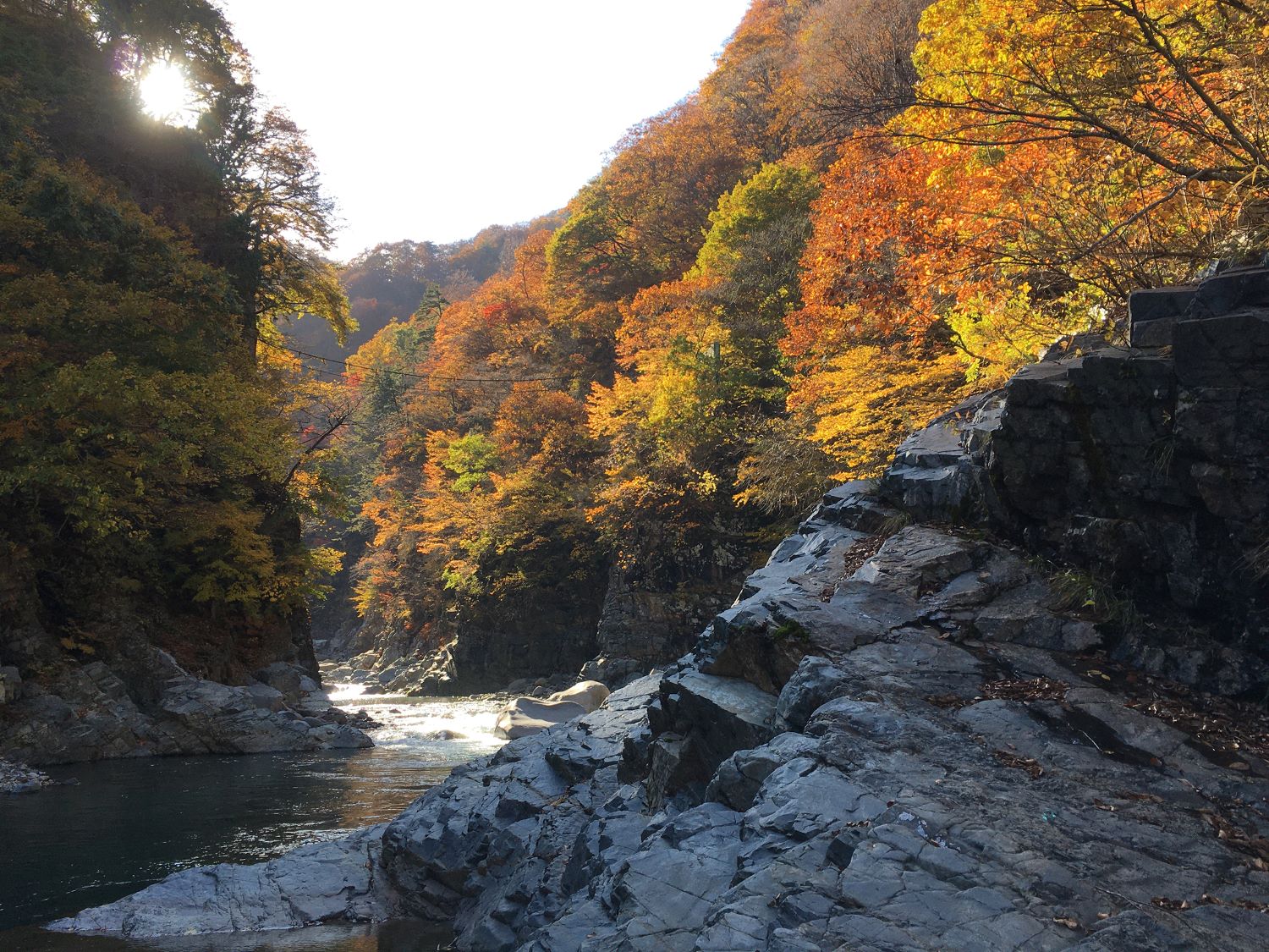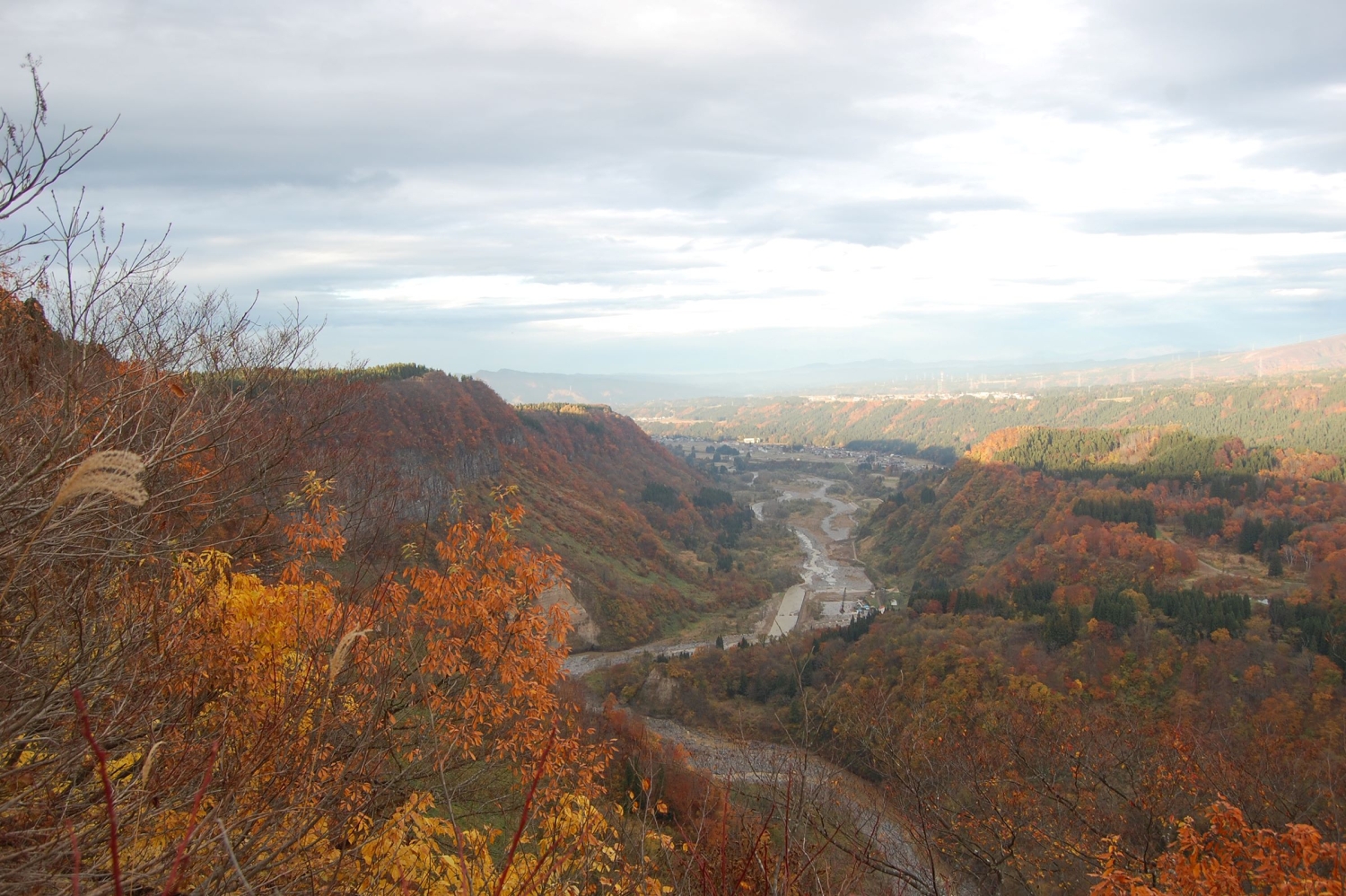 We drive about three kilometers (about two miles) upstream from the Ishizaka shrine and stop at Ryutatsumine (龍辰峰). There’s a small clearing that offers a sweeping view of the valley below.